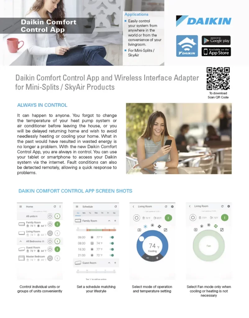 It can happen to anyone. You forgot to change the temperature of your heat pump system or air conditioner before leaving the house, or you will be delayed returning home and wish to avoid needlessly heating or cooling your home. What in the past would have resulted in wasted energy is no longer a problem. With the new Daikin WiFi Comfort Control App, you are always in control. You can use your tablet or smartphone to access your Daikin system via the Internet. Fault conditions can also be detected remotely, allowing a quick response to problems.